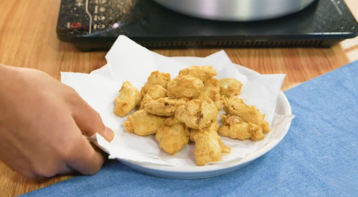 - Comenzar preparando el chicharrón de pescado. Cortar los filetes en trozos, y condimentarlos con sal, canela china, pimienta, orégano, sillao, ajo y mostaza. Luego, pasarlos por harina, huevo batido y harina (en ese orden). Finalmente, freírlos en abundante aceite caliente. Reservar.