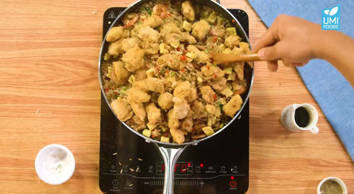 - Cuando el arroz esté impregnado de todos los sabores, adicionar la tortilla de huevos, el pimiento y la cebolla china (parte verde) picada, en cantidad al gusto. Revolver con cuidado.