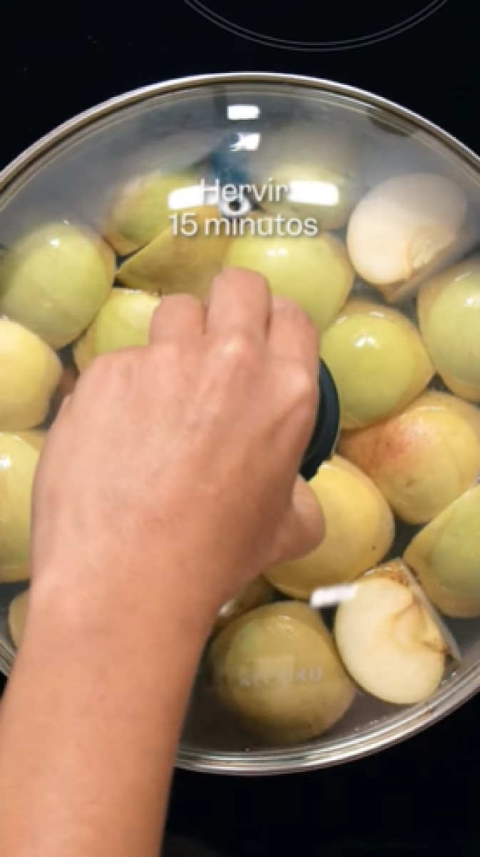 - Licuar las manzanas hervidas con el agua de la cocción. Luego, colar.
