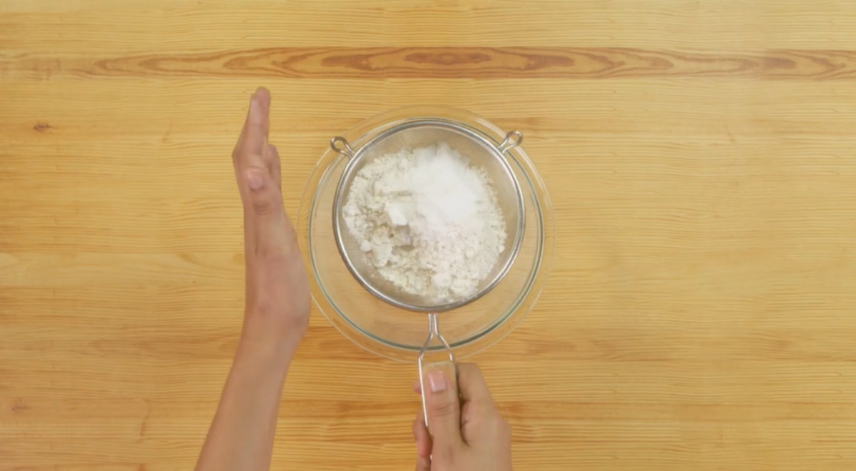 - Continuar con los ingredientes secos: cernir la harina, el polvo de hornear, el bicarbonato y la sal (puedes cernirlos pasándolos a través de un colador fino). Mezclar estos ingredientes una vez cernidos.