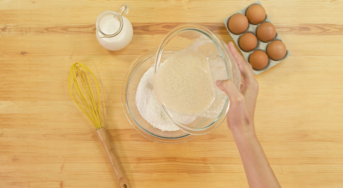- Volcar la mezcla de ingredientes líquidos sobre la mezcla de ingredientes secos. Integrar bien con el batidor de globo hasta obtener una masa lisa y homogénea (sin grumos). Colocar la masa en una jarra pequeña o en un recipiente con pico (esto hará más fácil echar la masa en la sartén).