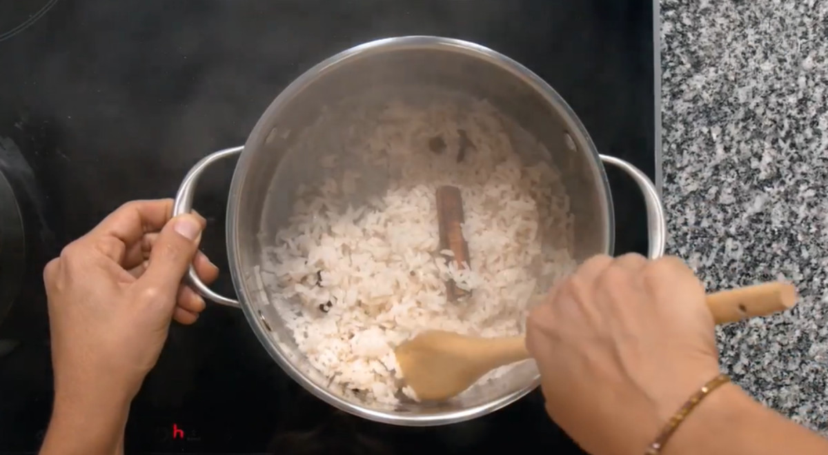 - Cocinar a fuego bajo hasta que seque. Mover con un trinche o tenedor para evitar romper los granos.