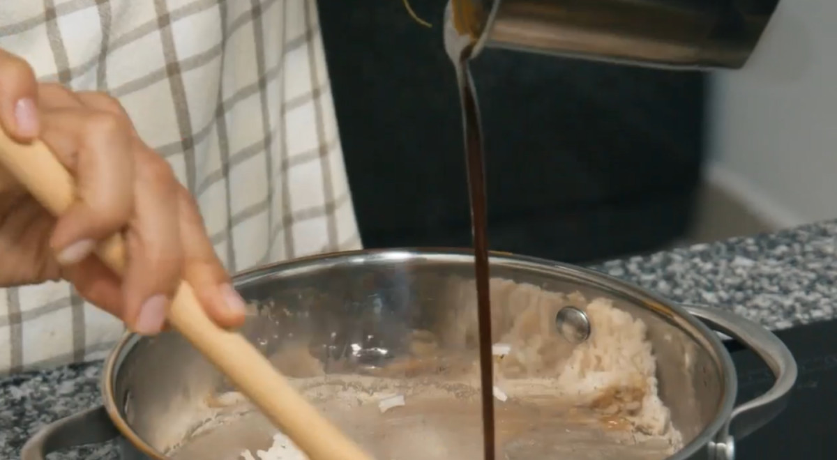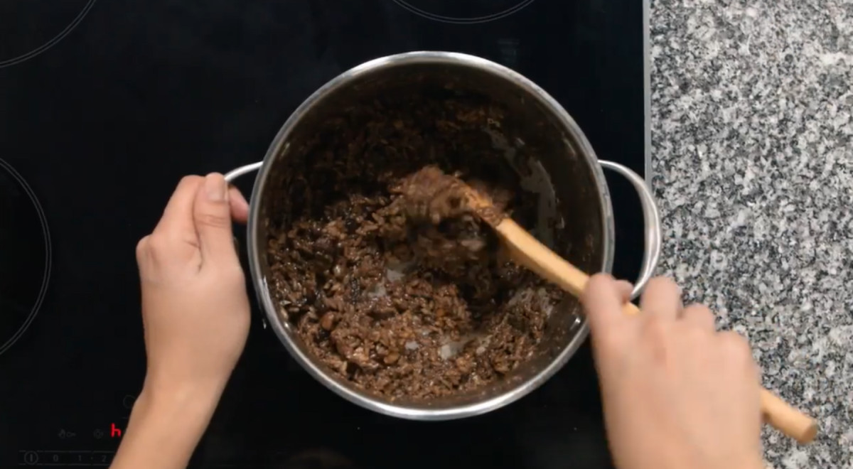 - Cuando haya espesado, incorporar al arroz cocido moviendo con un trinche o tenedor para evitar romper los granos.