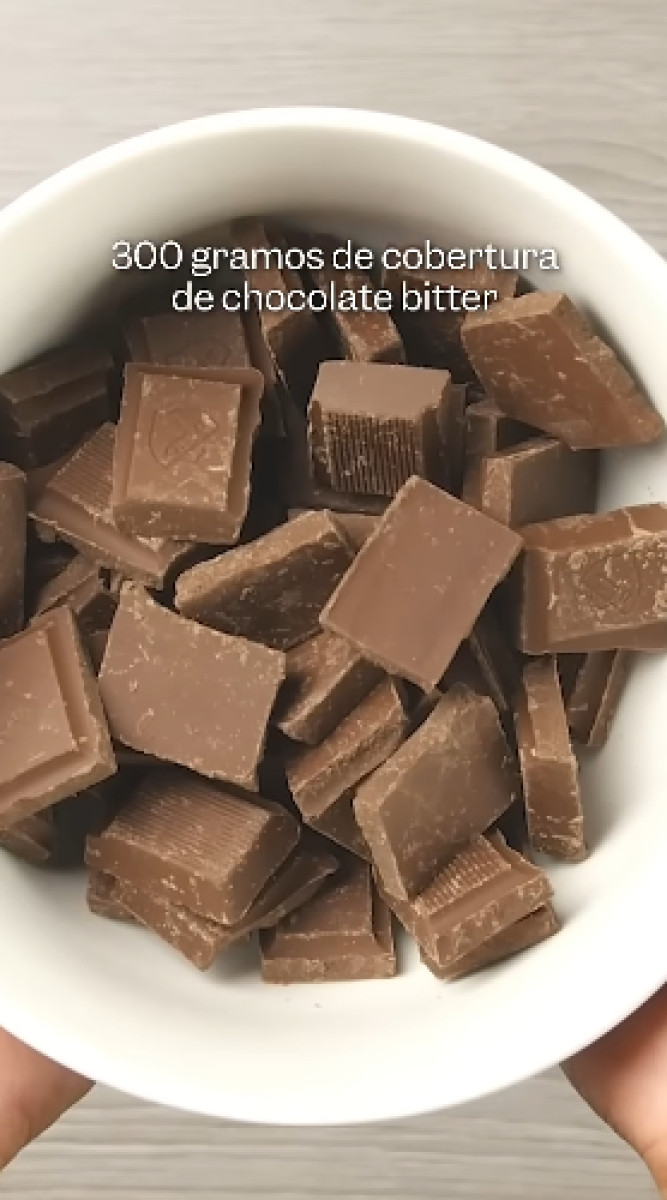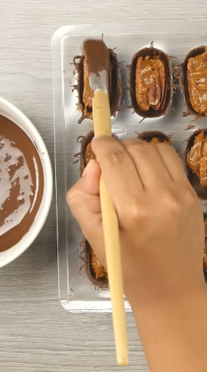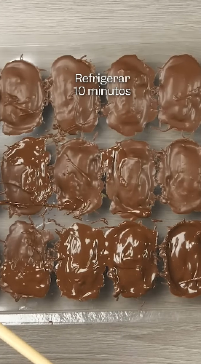 Los ingredienes son: cobertura de chocolate bitter, manjar blanco, pecanas y molde para chocotejas.