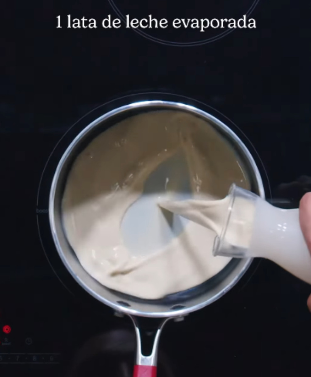 Colocar la leche evaporada y la leche condensada en una olla a fuego medio. Integrar bien.