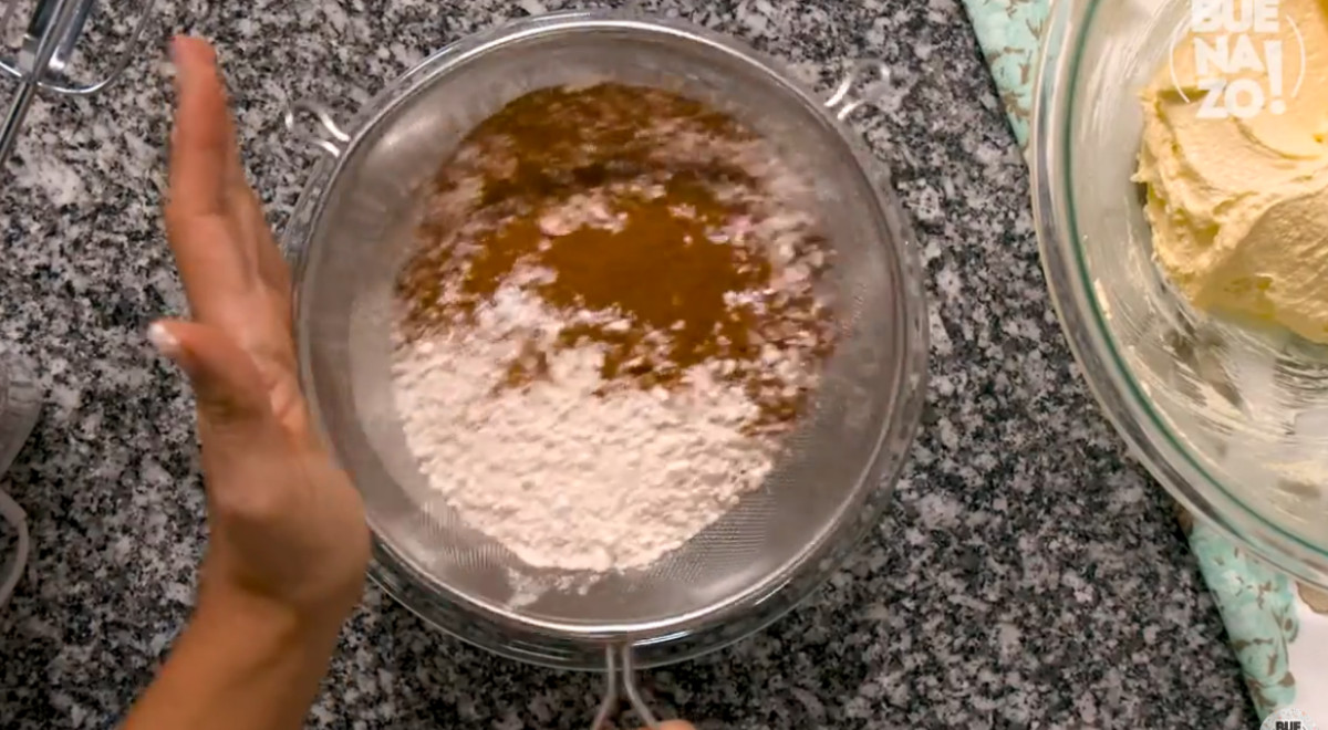 - Cierna 230 gramos de harina con la canela y el polvo para hornear. Incorpórelos poco a poco y con movimientos envolventes a la mezcla anterior.