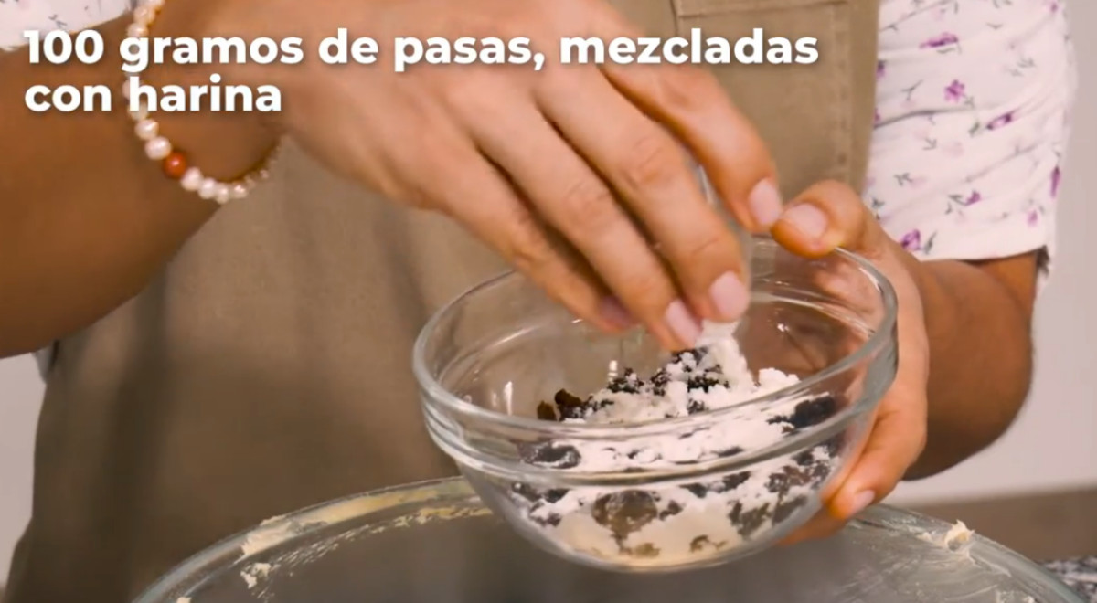 - Enharine las pasas con 2 cucharadas de harina y añádalas a la mezcla.