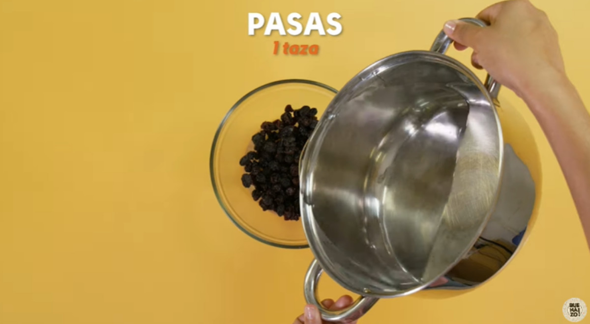 - Remojar las pasas en agua recién hervida por 15 minutos. Luego colar y remojarlas en el pisco por 30 minutos. Reservar.