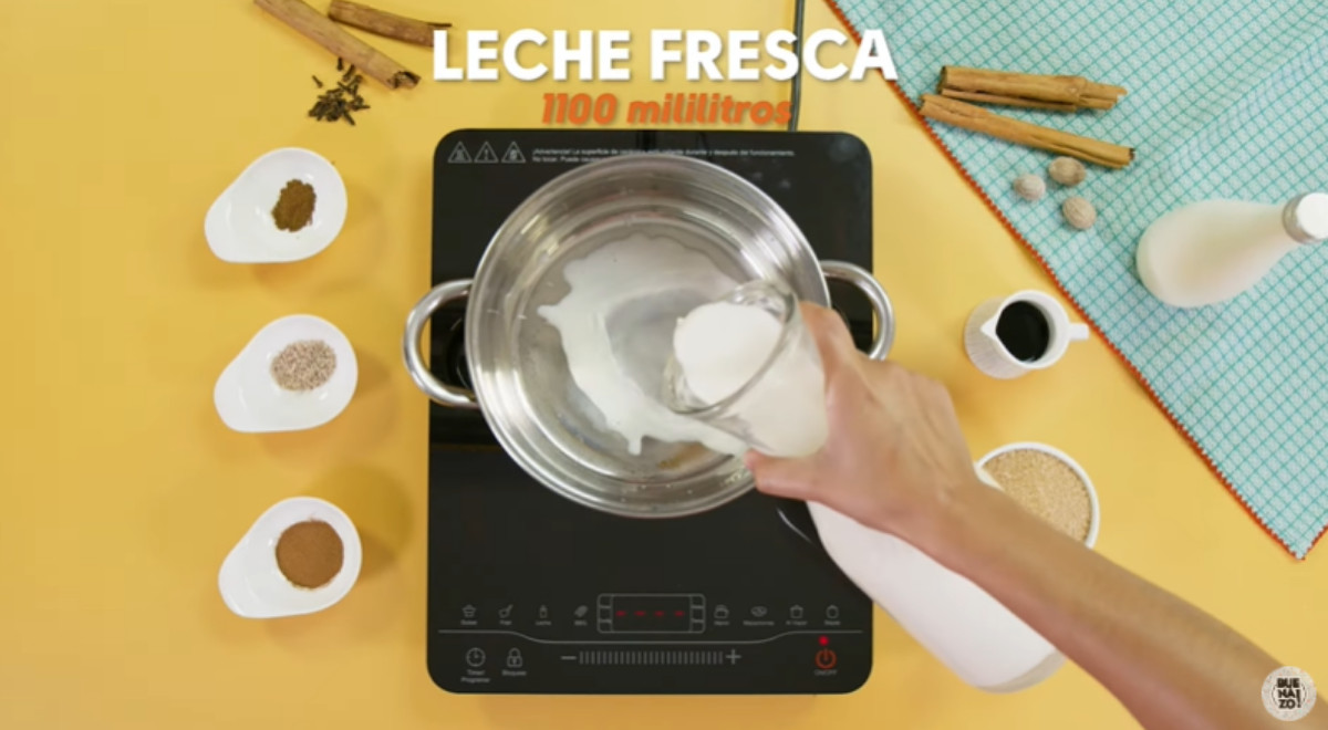 - Calentar la leche en una olla a fuego medio bajo. Cuando esté tibia, agregar la canela, la nuez moscada, el clavo de olor, la vainilla, el azúcar rubia y las ralladuras. Esperar a que dé un hervor y retirar del fuego.