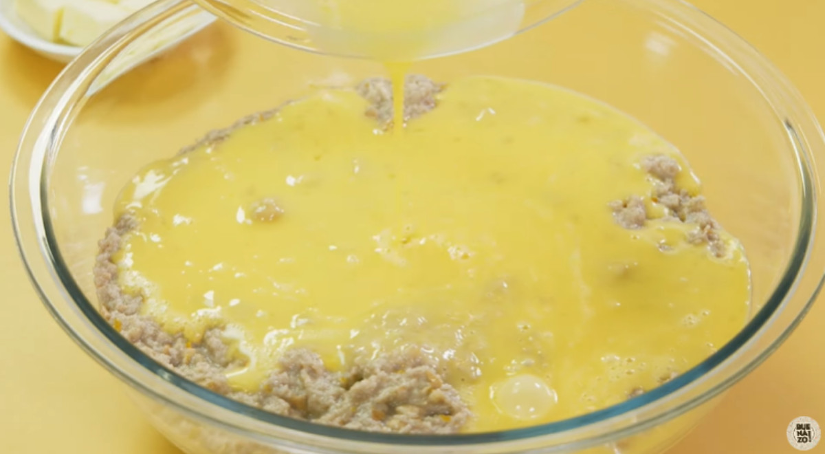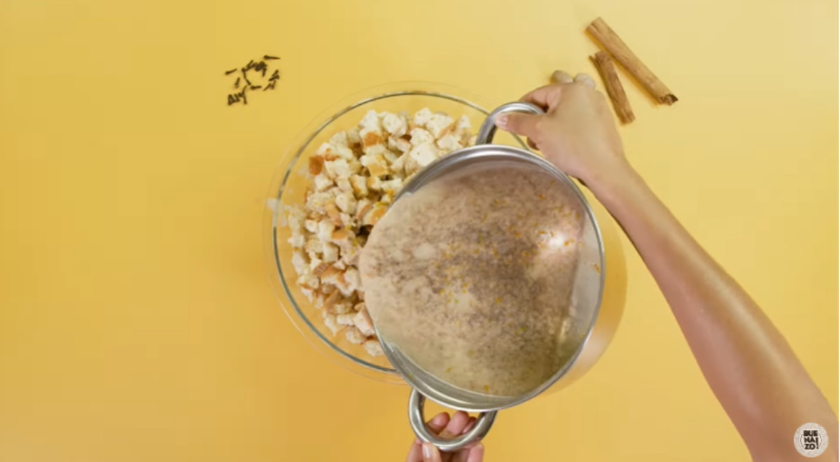 - Verter la mezcla de leche caliente sobre el pan francés desmenuzado. Dejar reposar por 30 minutos. Luego triturar el pan remojado hasta obtener una masa.