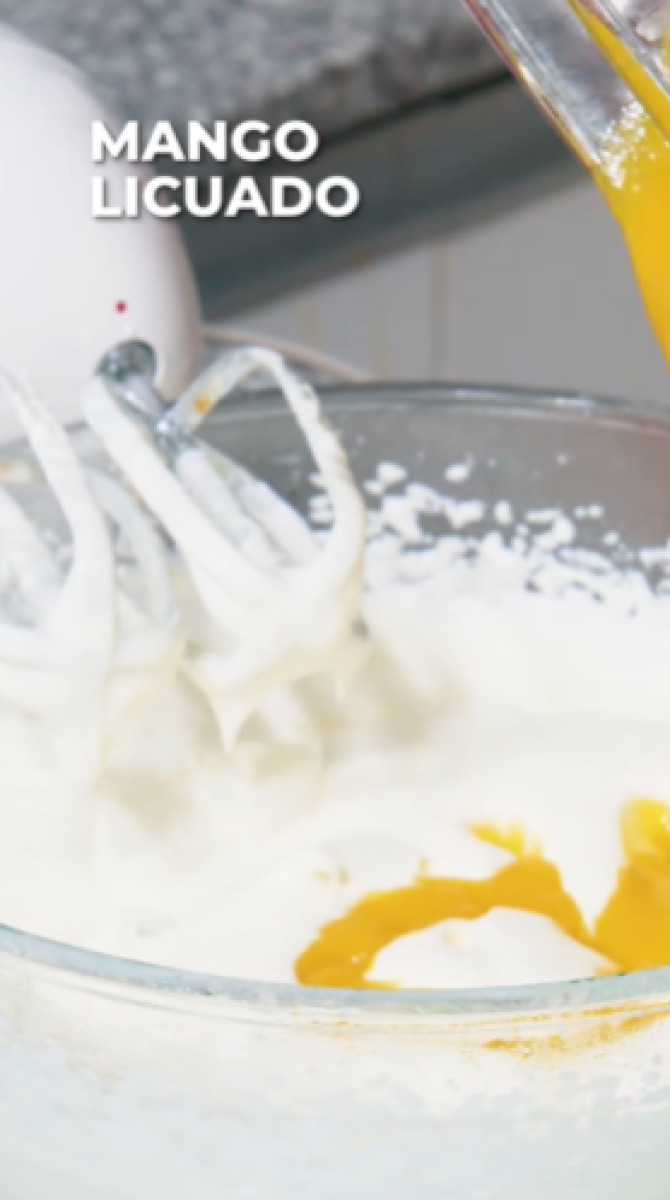 - Agregar el puré de mango, batir para incorporar y terminar de mezclar con una espátula.