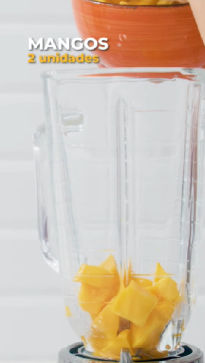 1.5 litros- Pelar y picar los mangos. Luego, licuarlos (sin agua) hasta obtener una especie de puré de mango.