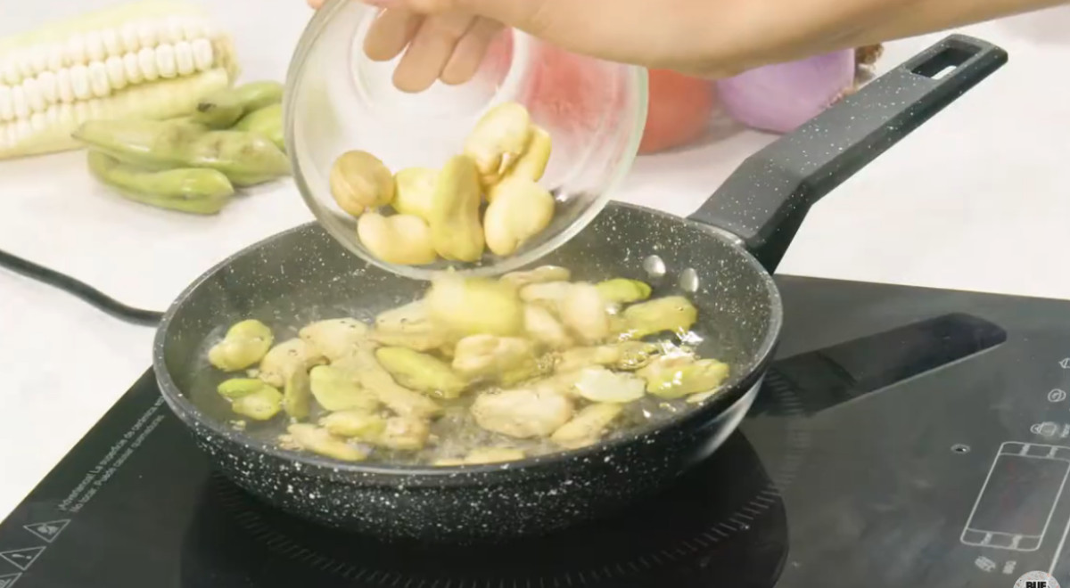8 porciones- Pelar las habas y llevar a cocinar en agua hirviendo con un poco de sal.