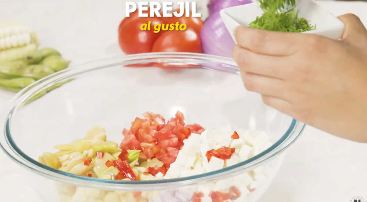 Esta receta se prepara con haba, choclo, queso, tomate, cebolla, aceituna, perejil, rocoto, vinagre y limón.