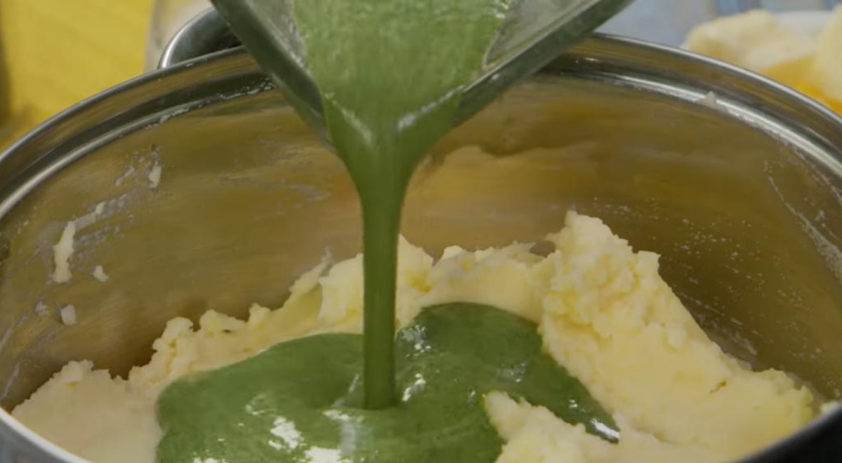 - Colocar una olla al fuego. Agregar la papa prensada y soltarla con 100 mililitros de leche fresca. Añadir las espinacas licuadas y mover hasta integrar bien.