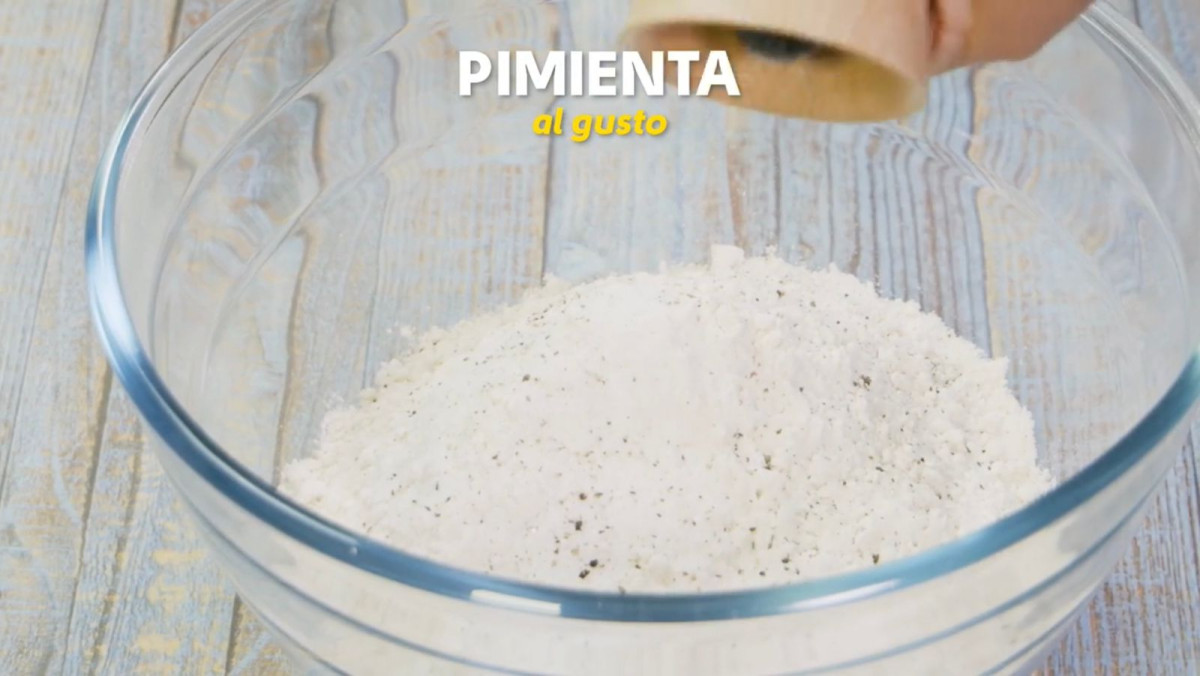 - En un bol colocar la harina, agregar una pizca de sal y pimienta. Mezclar y reservar.