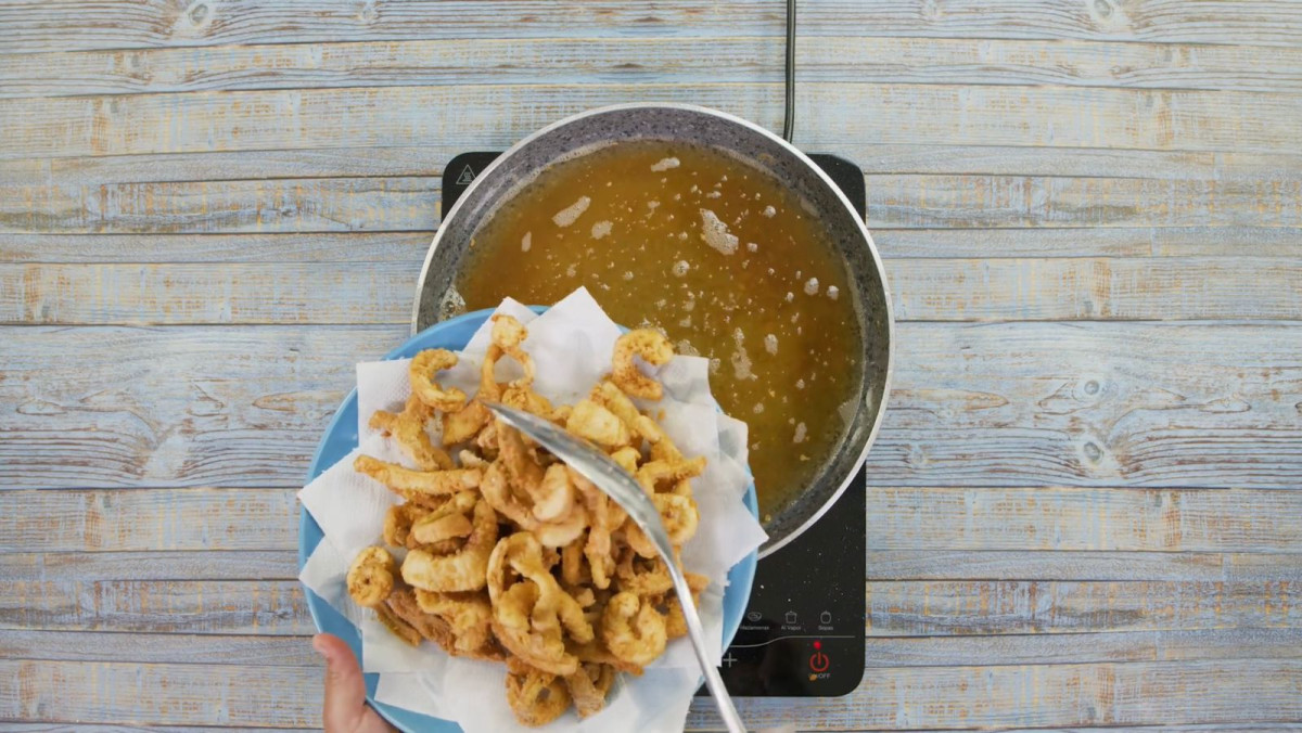 - Retirar la pota con ayuda de una espumadera y freír en abundante aceite.