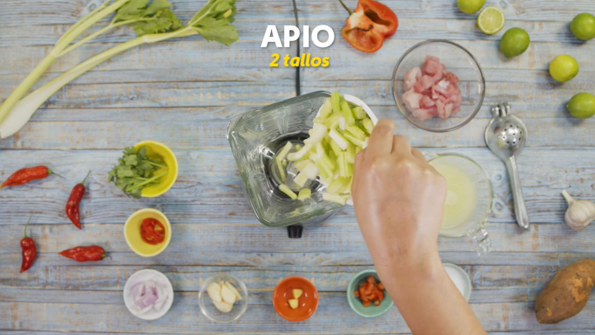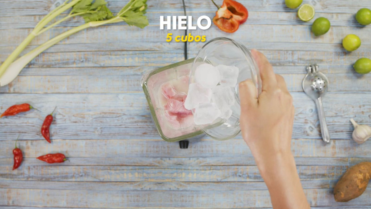 - Agregar el culantro, el ají limo, la cebolla, el ajo, el kion, el rocoto, el jugo de limón, el pescado y el hielo, y una pizca de sal.