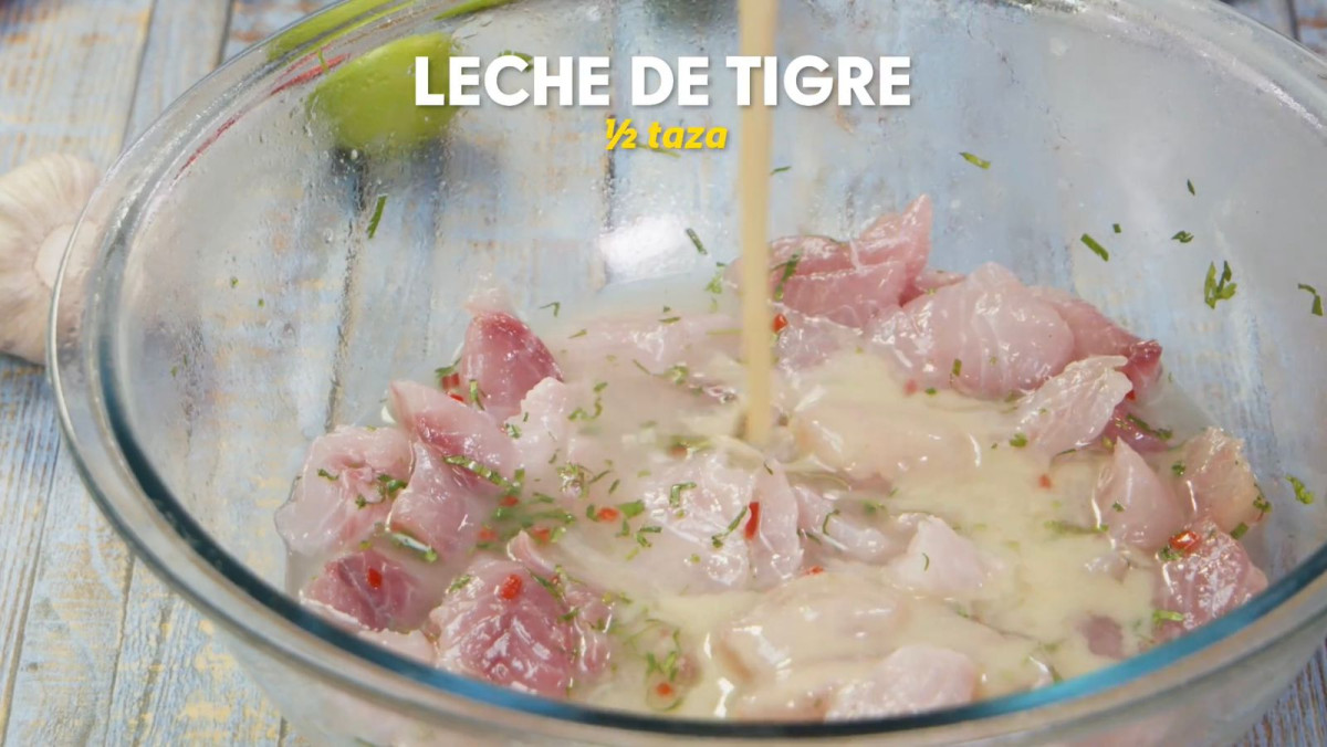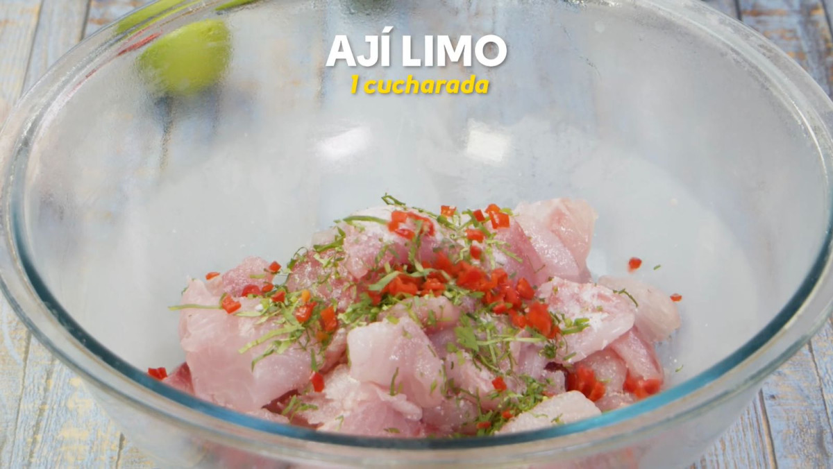 El ceviche se prepara con pescado, ají limo, culantro, jugo de limón, leche de tigre, cebolla y sal.