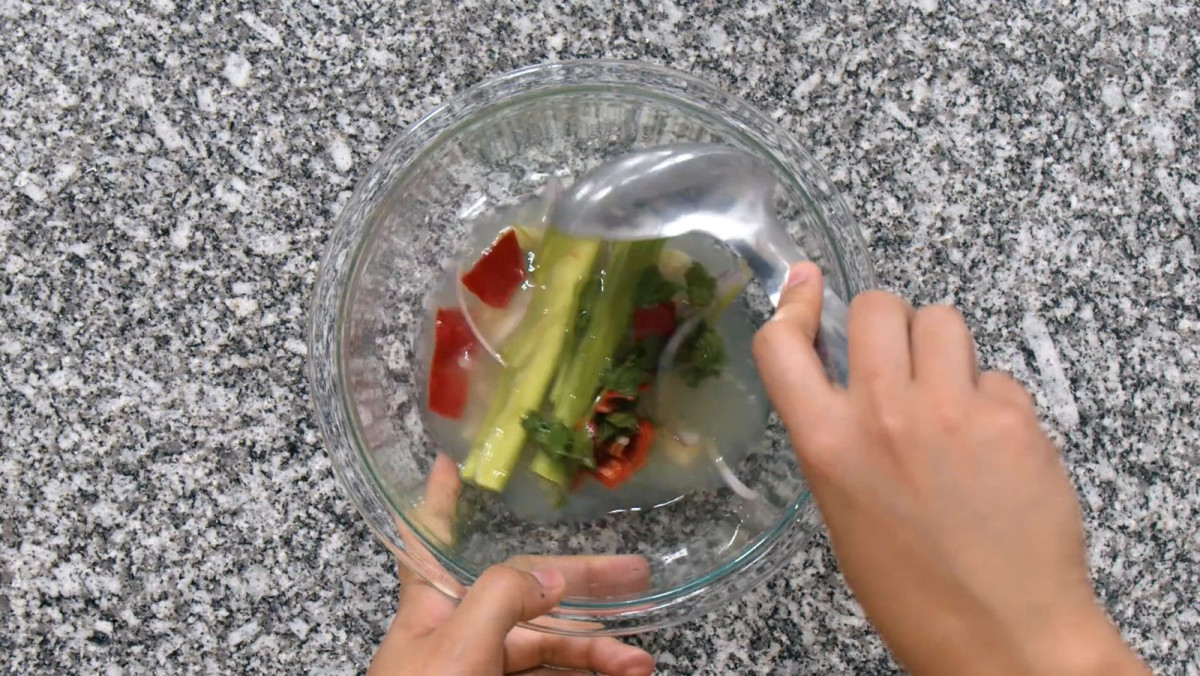 - Aplastar ligeramente los tallos de apio y los dientes de ajo. Colocarlos en un tazón junto con trozos de ají limo, de cebolla, ramas de culantro, sal y el jugo de los limones. Presionar todos estos ingredientes con una cuchara para que suelten sus aromas y saboricen el jugo de limón.