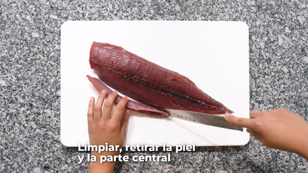 2- Limpiar el filete de bonito con ayuda de un cuchillo. Retirar la piel y la parte central, donde puede haber espinas. Cortar en cubos y refrigerar.