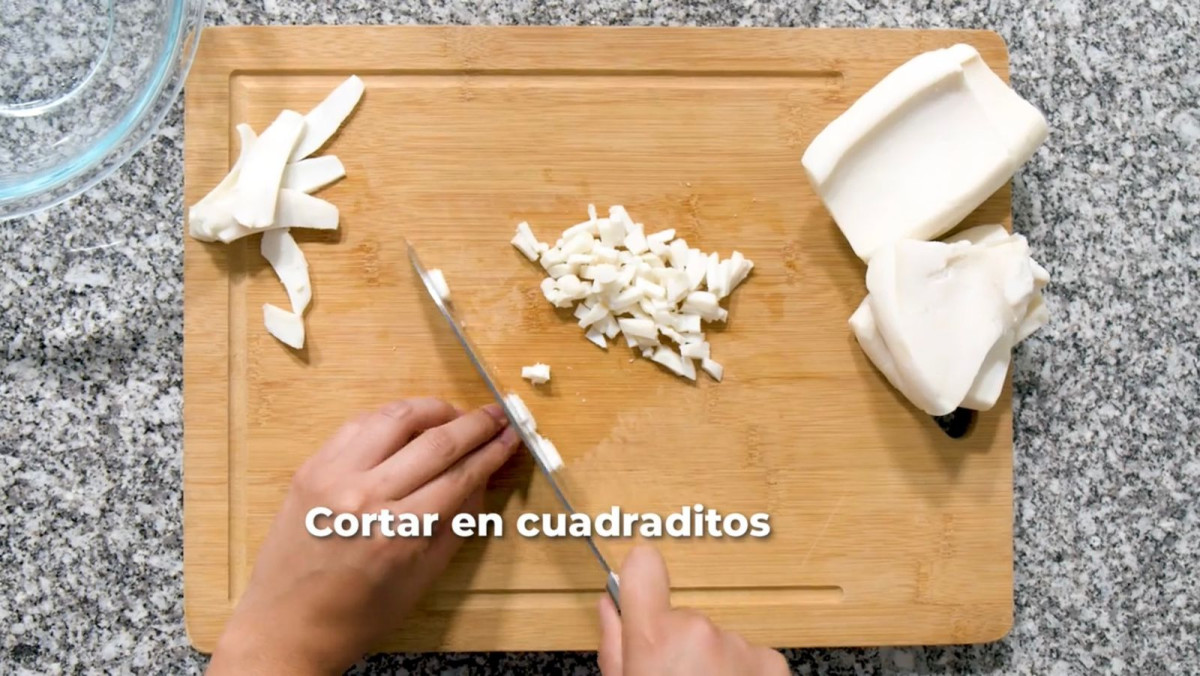 - Retirar la piel de la pota ya cocida. Una vez sin piel, cortar en cuadraditos.