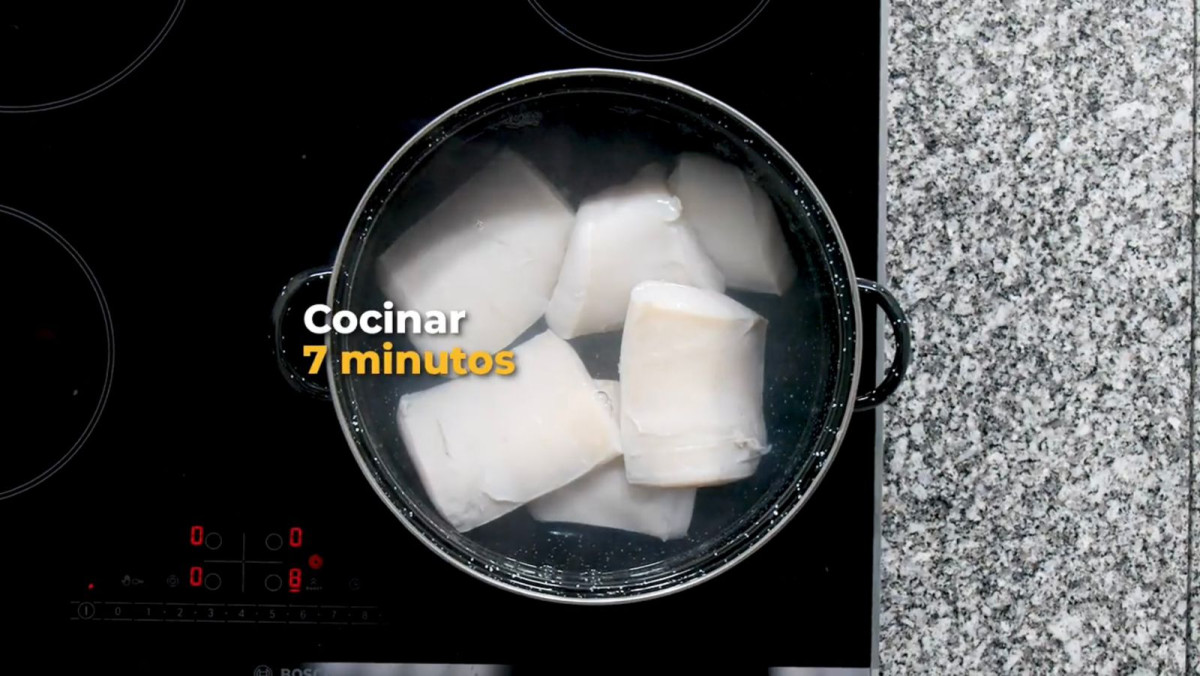 - Poner agua a hervir. Cuando esté en ebullición, añadir sal y la pota. Cocinar por 7 minutos. Luego, sumergir la pota en agua con hielo para cortar la cocción.