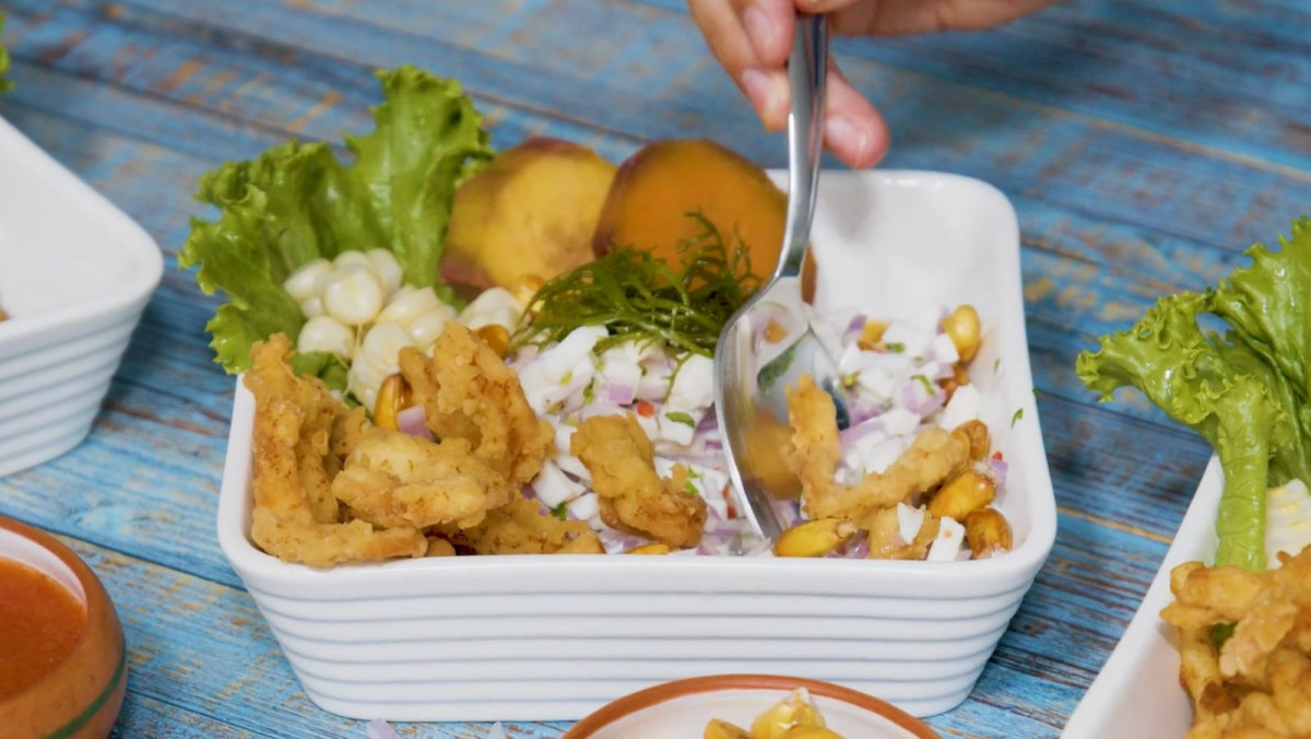 Este plato marino se prepara con pota, limón, cebolla roja, ají limo, apio, culantro, ajo molido, rocoto, caldo de pescado, lechuga, choclo, camote, yuyo, chicharrón de pota y canchita serrana.