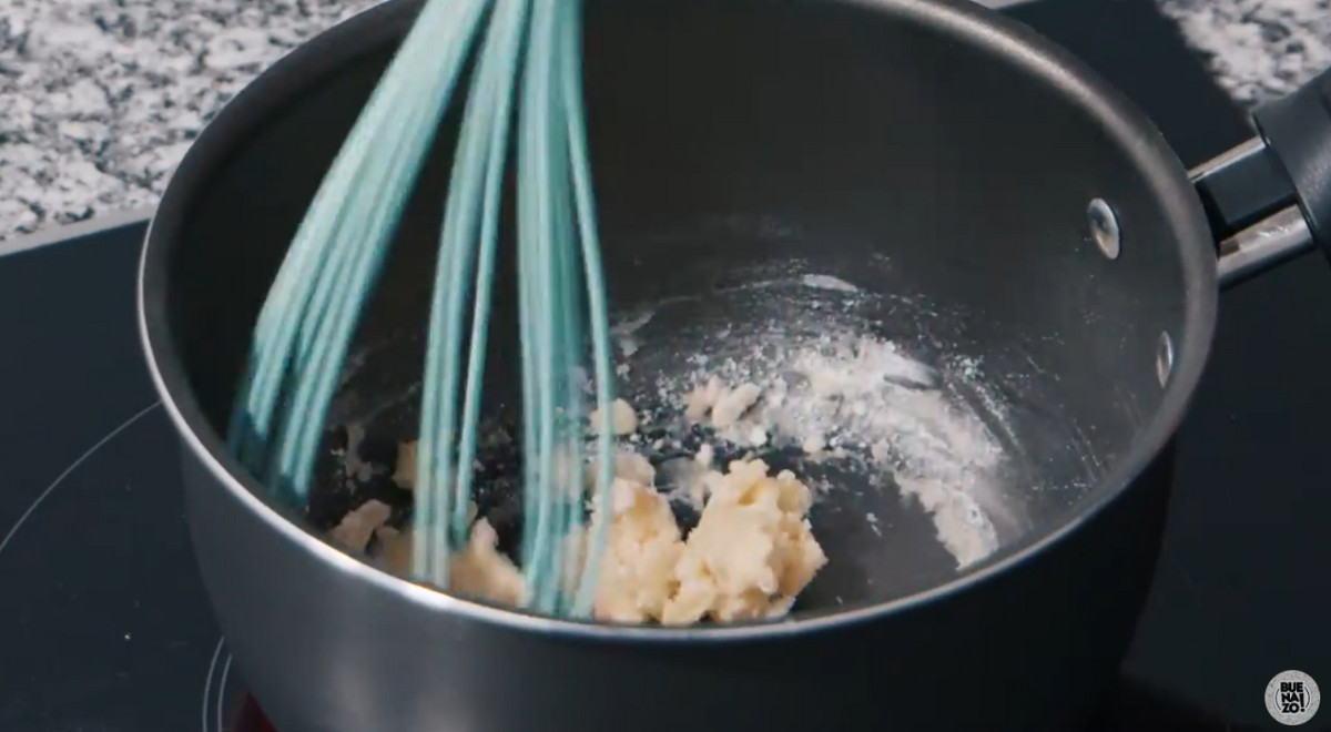 Derretir la mantequilla en una olla pequeña. Agregar la harina y mezclar hasta formar una pasta. Cocinar esta pasta por unos minutos, sin dejar de revolver para evitar que se queme.