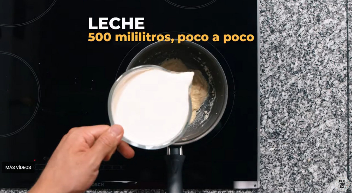 Añadir la leche poco a poco. Revolver por 8 minutos aproximadamente a fuego bajo, hasta espesar y obtener una salsa bechamel suave. Sazonar con sal, pimienta y nuez moscada.