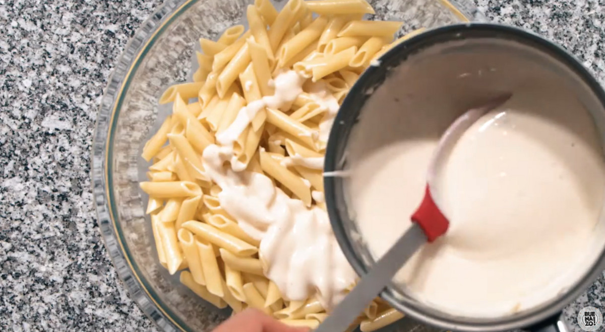 Mezclar los fideos con la salsa bechamel (reservar un poco de la salsa para el armado). Echar los huevos batidos a los fideos con salsa. Integrar muy bien.