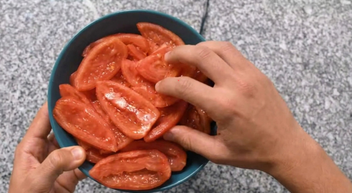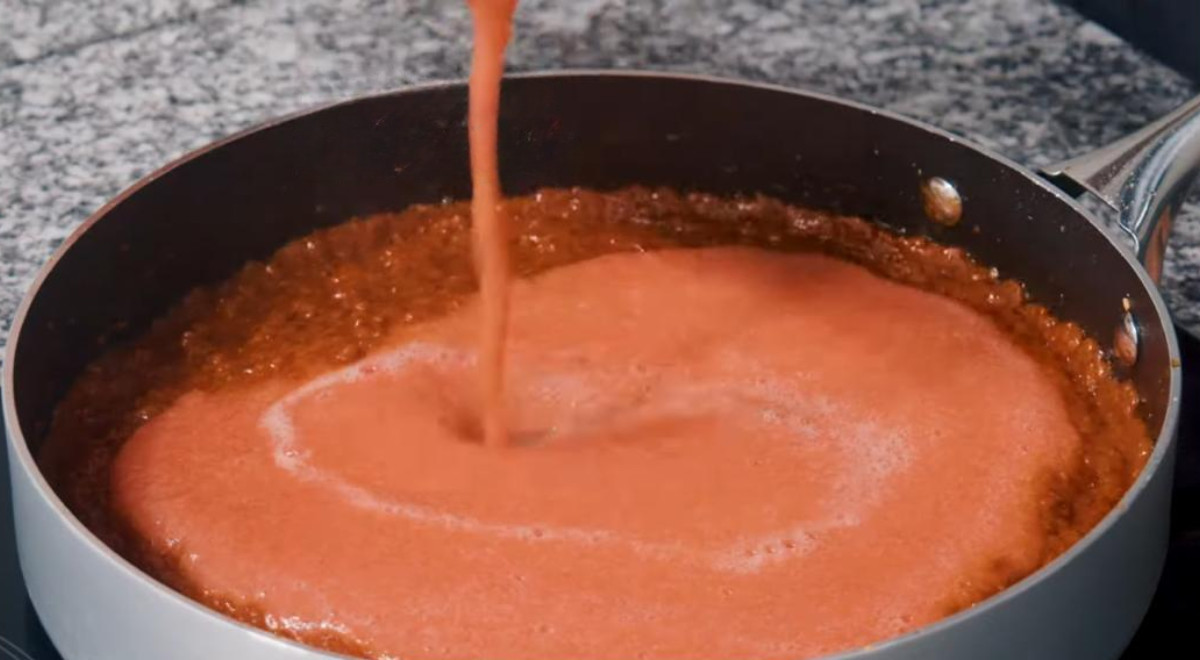 - Licuar los tomates con unos 100 mililitros de agua. Reservar.