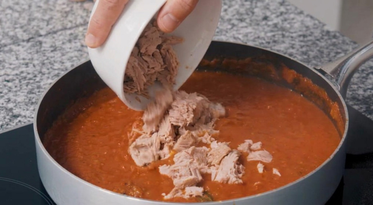 - Incorporar el atún previamente escurrido y desmenuzado.