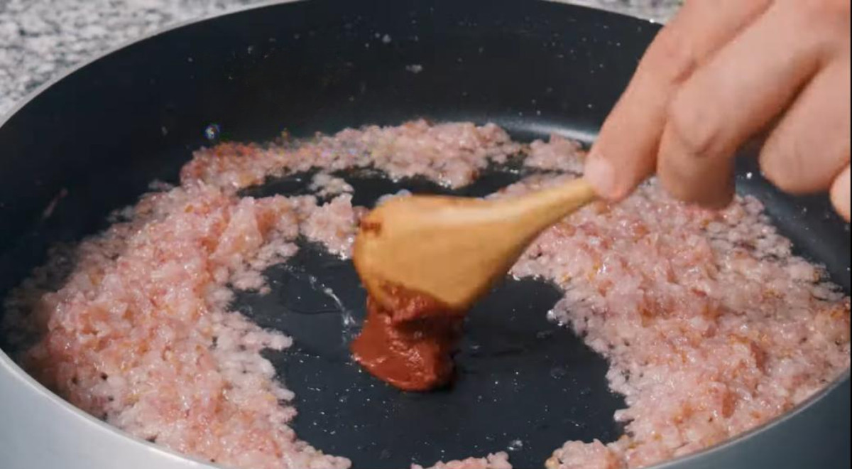 - Calentar un chorro de aceite en una olla o sartén, y sofreír la cebolla con una pizca de sal. Agregar el ajo, la pasta de tomate y la salsa de tomate (un ingrediente a la vez).