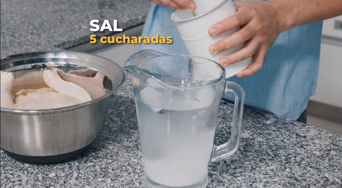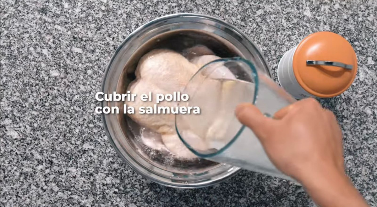 2. Sumergir el pollo entero y refrigerar en salmuera por 8 horas.