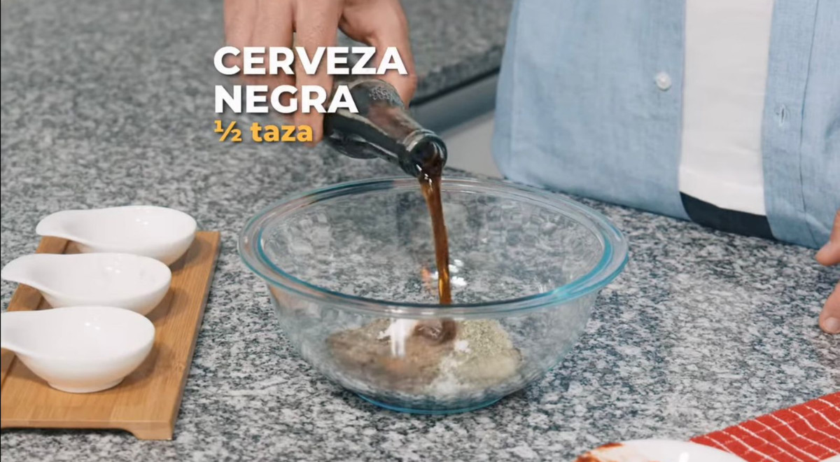 4. Agregar la pimienta negra y una cucharadita de sal. Añadir el comino, el sillao, el orégano, el ajo molido, el ají panca y la cerveza negra. Mezclar y rectificar la sal. Reservar esta marinada.