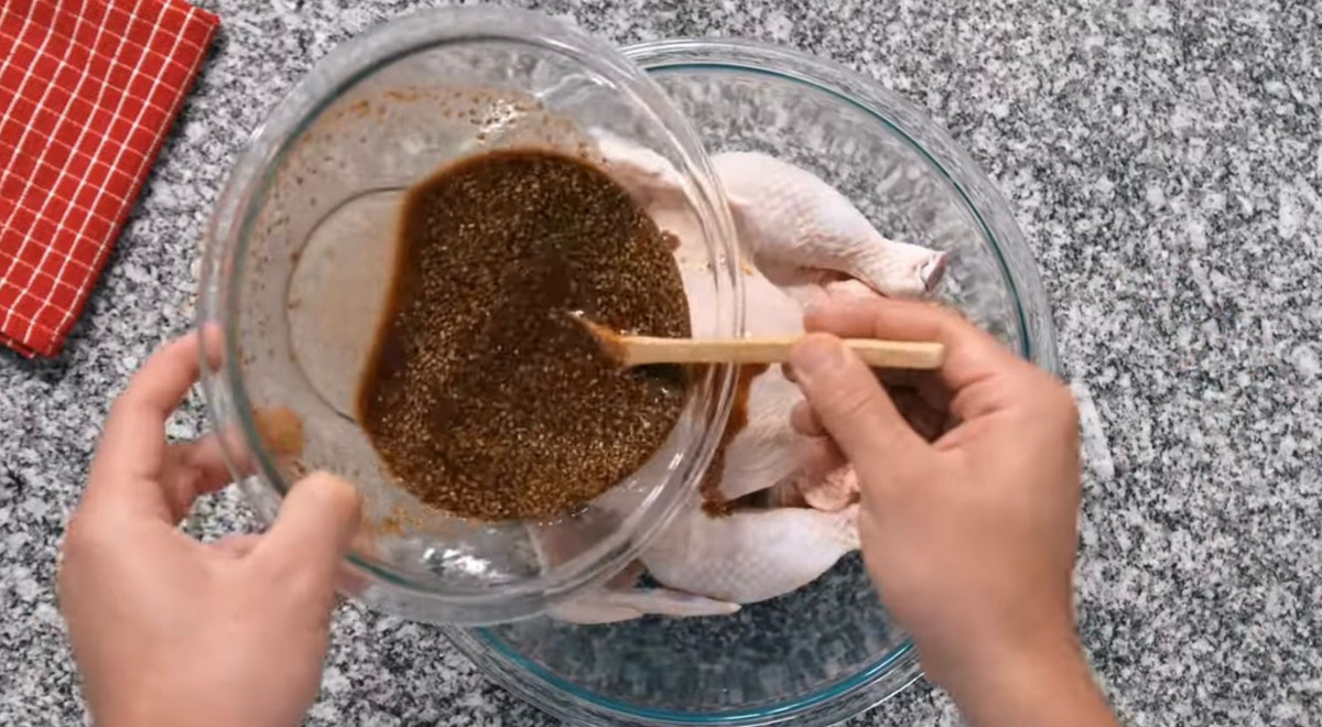 6. Bañarlo con la marinada. Procurar introducir la mezcla entre la piel y la carne. Tapar el bowl con papel film y dejarlo reposar por al menos ocho horas más con la pechuga hacia abajo. Darle la vuelta un par de horas antes de sacarlo.