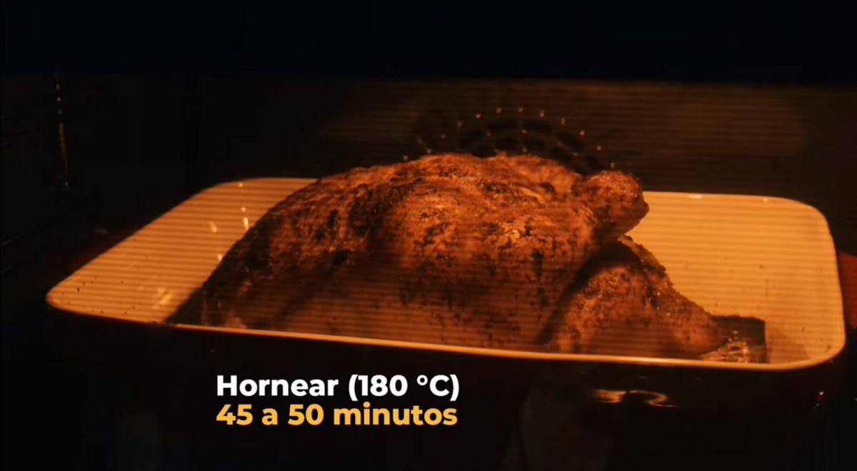 9. Pasados los primeros 40 minutos, bañarlo con el jugo que quedó de la marinada. Girar la bandeja 3 o 4 veces durante la cocción para que se cocine parejo.