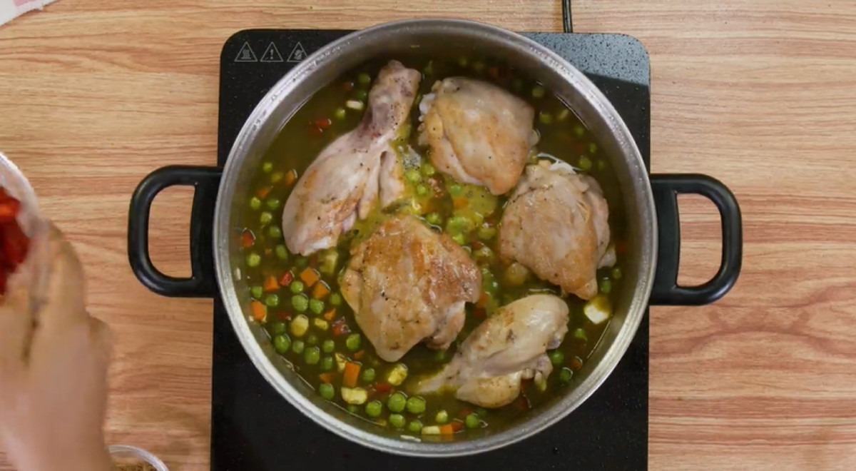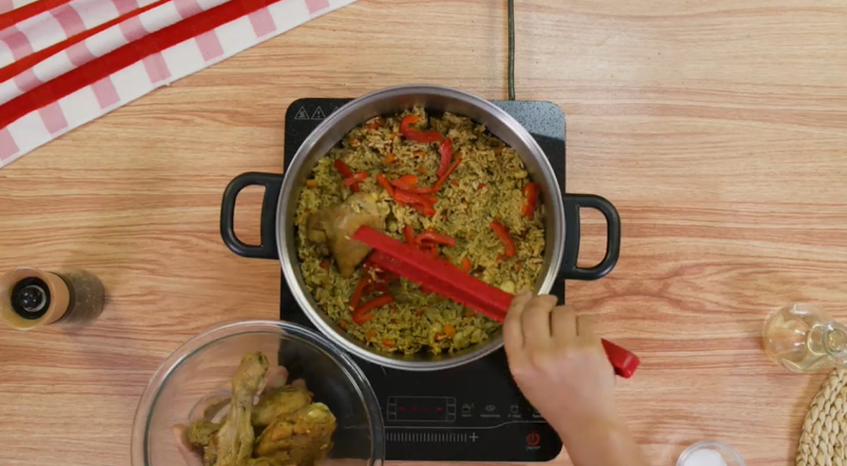 - Rectificar el punto de sal y cocinar a fuego bajo por 20 minutos o hasta que el arroz esté cocido (mover a ratos para evitar que la preparación se pegue al fondo). Luego, apagar el fuego y reincorporar las presas. Dejar reposar unos minutos antes de servir.