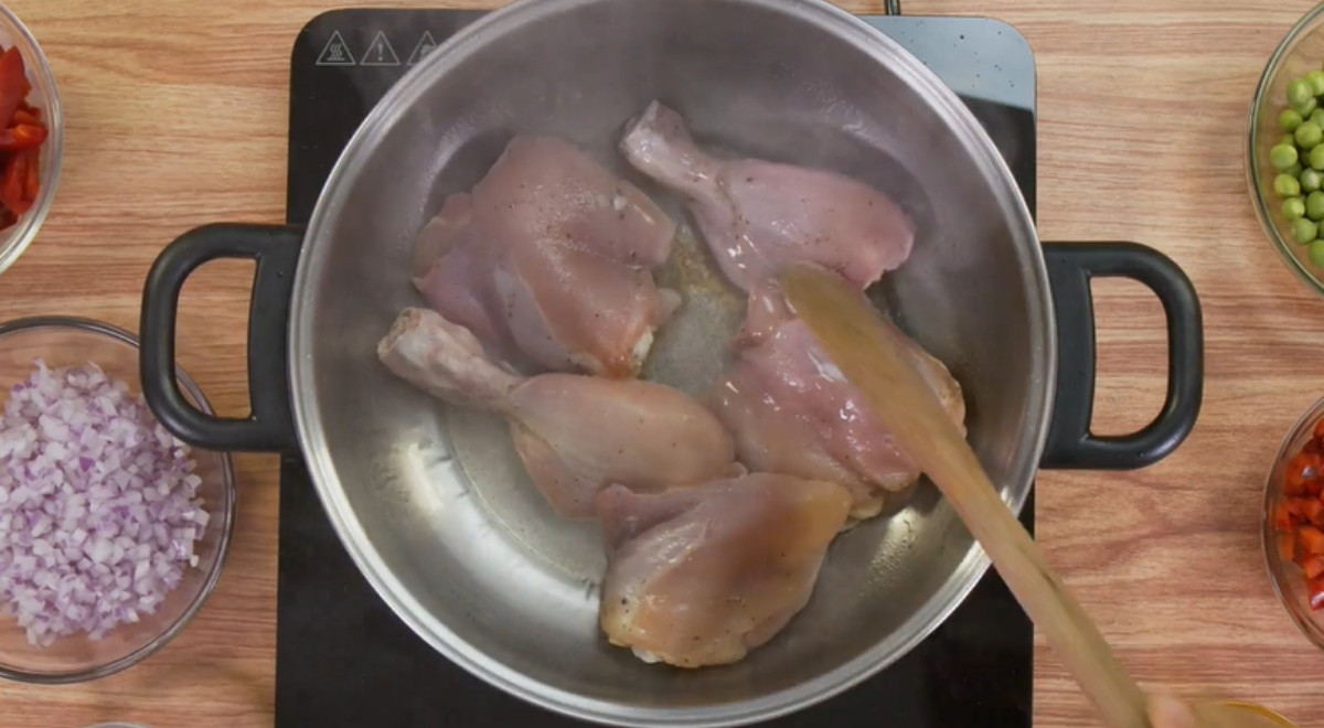 La mejor manera de cocinar el pollo es salpimentar las presas y luego colocarlas en una olla con un poco de aceite a fuego medio para sellarlas por ambos lados.