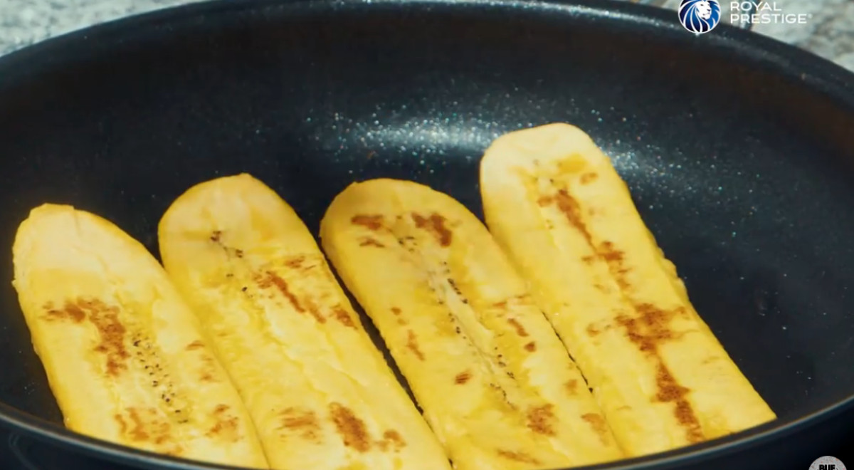 - Precalentar la sartén Deluxe Easy Release de Royal Prestige® a temperatura media durante 30 segundos. Esparcir un poco de aceite con papel toalla. Bajar el fuego a mínimo, agregar las tajadas de plátano y cocinar por 5 minutos. Dar la vuelta y dejar dorar. Reservar.