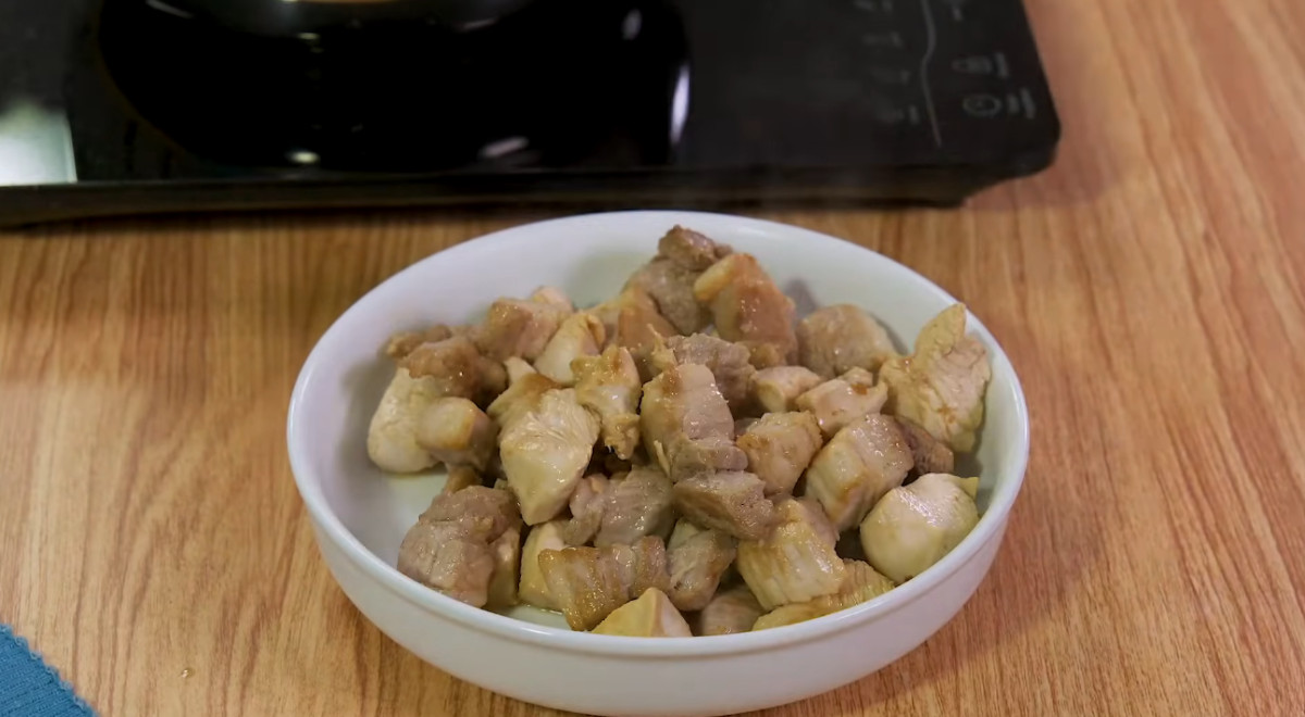 - Calentar el aceite en una olla, agregar la panceta y sellar. Añadir el pollo y seguir sellando. Reservar las carnes.