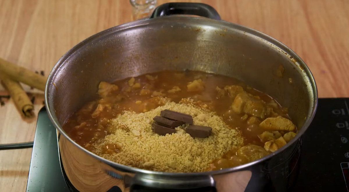 Esta receta se prepara con panceta de cerdo, pollo, papa seca, maní cebolla, ají panca, ají amarillo, ajo, anís, chocolate y clavo de olor.