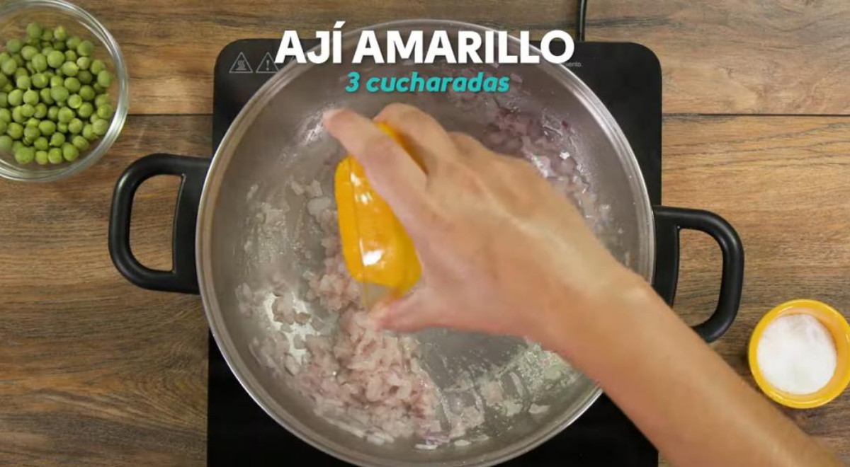 Esta receta lleva papa, zanahoria, arvejas, pollo, cebolla, ajo, ají amarillo, palillo, hierbabuena, arroz y caldo de pollo.