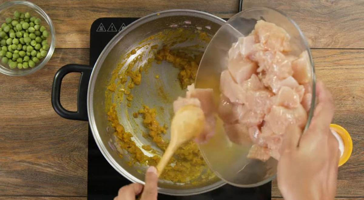 - Añadir el pollo en cubos y dorar.