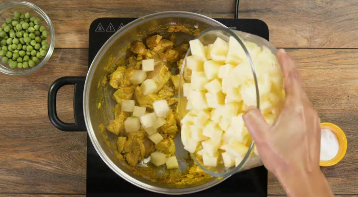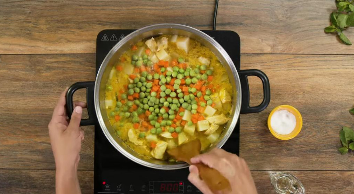 - Añadir las arvejas y la zanahoria. Revolver y dejar cocinar de 10 a 15 minutos hasta que cocinen las papas y las verduras.