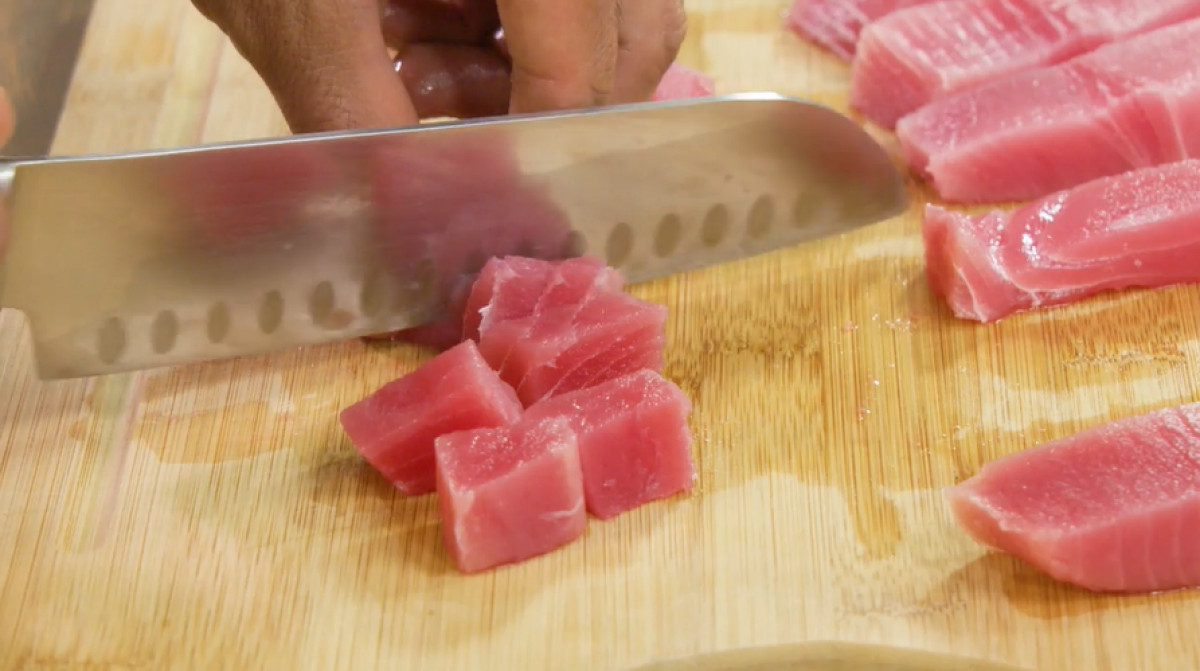 - Cortar los filetes de atún en cubos y sazonarlos con sal.