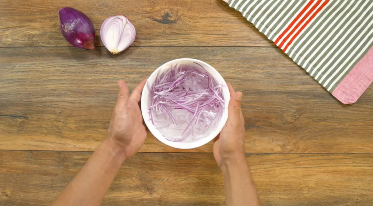 - Cortar la cebolla roja en juliana y sumergirla en agua con hielo. Escurrirla bien antes de usar.