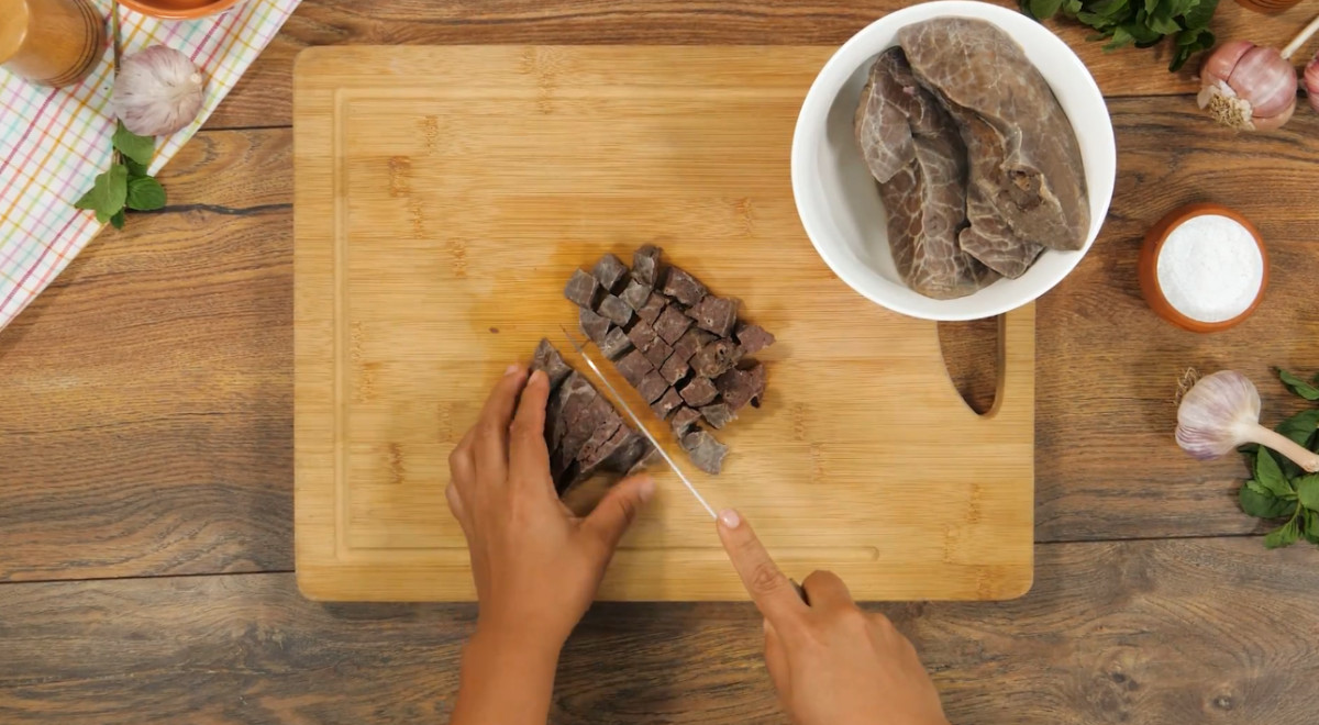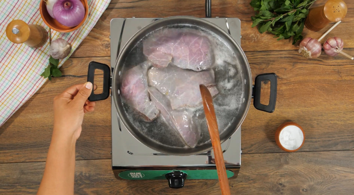 - Colocar el bofe en una olla y cubrirlo con agua. Agregar sal y una rama de hierbabuena.