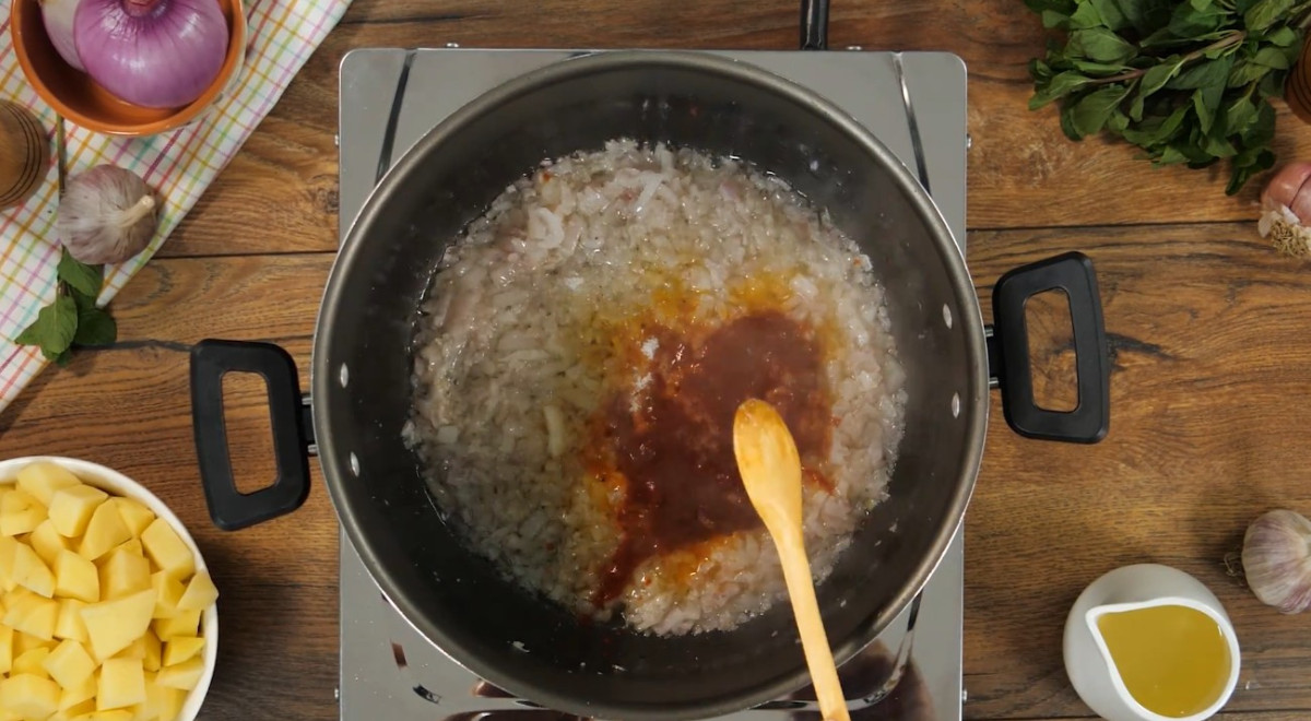 - Colocar aceite en una olla y agregar 2 unidades de cebolla cortada en cuadraditos. Añadir el ajo, el ají panca, sal y pimienta. Mezclar.